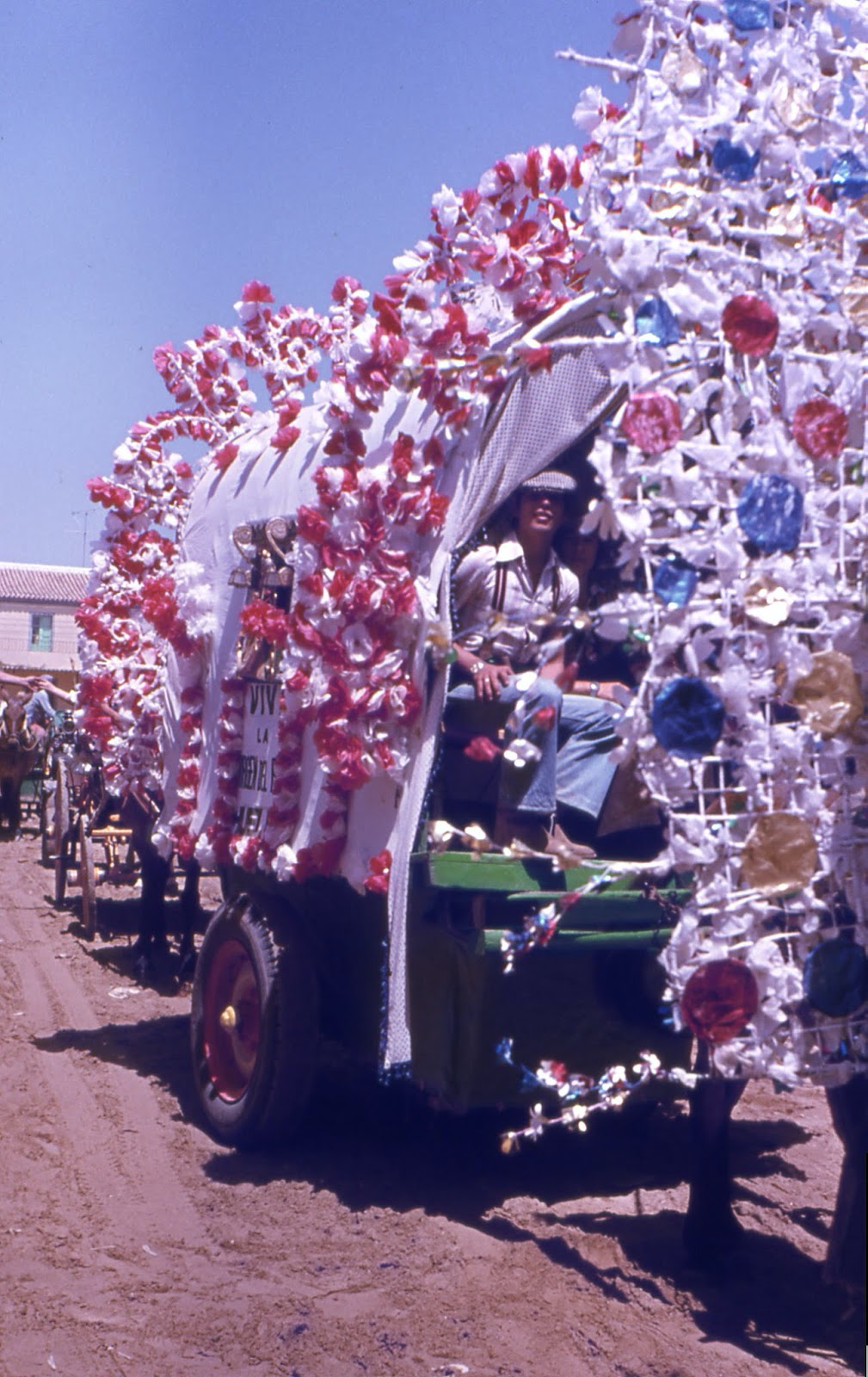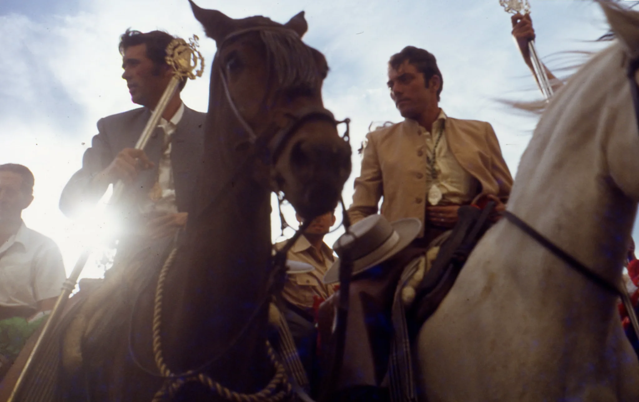 En mi memoria visual, como en la de la mayoría, antes de 1980 El Rocío eran las imágenes de NO-DO y de los telediarios. Una estampa fugaz de la procesión y de las carretas que aparecía de vez en cuando en las «españoladas» del cine «folklórico» franquista que esta reseñado en la obra citada de García Espino. La espectacularidad de la procesión en las décadas del NO-DO hubieron de influir en la representación de todos nosotros del Rocío, como lo hicieron las imágenes de los tambores de Calanda en el Peppermint Frappé de Carlos Saura (1967). Esas imágenes del Rocío influyeron en la secuencia que Jacint Esteva rodó para su maravilloso Lejos de los árboles (1970), en la tesis de la aproximación fallida, por un simplismo propio de la Transición, en Rocío de Fernando Ruiz de 1980 e, indudablemente, en nuestros rodajes de 1979-83. El Rocío de Esteva se inscribe en el mosaico etnográfico de su película; Ruiz, propuso una interpretación esquemática económico política del Rocío en el contexto de la Transición en el marco de lo que se llamó «cine militante». En 1978 yo habia visto ese material. Rodamos con tres cámaras con instrucciones que evitasen al máximo los planos generales y los aspectos más «folklóricos». En toda esta imaginería se observa una mirada situacionista, simbolizada en cierta medida en el papel de la Guardia Civil con tricornio o en nuestro caso de la Marcha Real como representación de cierta concepción de las relaciones entre Iglesia y Estado en el marco de celebraciones populares del franquismo y del tardofranquismo.